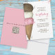 Este design apresenta um giro aniversário de sorvete de aquarela, um roteiro de caligrafia na moda, uma comemoração branca festiva divertida, um URL online de código QR, um cone de waffle de sorvete, um design mínimo minimalista simples, um aniversário de verão celebra uma festa, um chocolate branco rosa, um cone de sorvete de sabor napolitano, um divertido e único convite de aniversário, um sorvete temático convites