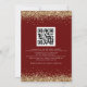 Código QR moderno dourado com brilho e burgundy para casamento. Adicione seu código QR ao site do seu casamento no verso, o que torna esta uma opção conveniente para que seus convidados respondam e vejam todos os detalhes sem a necessidade de cartões separados de RSVP e detalhes. Você pode criar códigos QR gratuitamente online. Basta procurar por “criador de código QR” e muitas opções surgirão para criar gratuitamente. Ou você pode remover isso se não for necessário. Um conjunto de texto manuscrito para casamento e o restante do texto você pode personalizar facilmente, com uma borda falsa brilhante em dourado em ambos os lados.