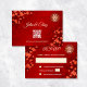 A cereja vermelha floresce num fundo vermelho brilhante e um símbolo de felicidade dupla dourada. Cartão de Casamento Chinês RSVP. Na parte de trás está um código qr digitalizável para o seu site de casamento.
