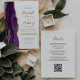 A borda esquerda apresenta uma borda agitada de cor púrpura, aparada com brilho dourado. O texto personalizável combina manuscrito dourado, fontes em copperplate e itálico em um fundo branco. O verso fornece espaço para detalhes do casamento em um fundo branco sólido, junto com um código QR que os convidados podem digitalizar para visitar seu site e RSVP, o que economiza o custo de imprimir e enviar cartões RSVP separados.
