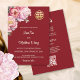Este elegante convite de casamento chinês mostra peônias de aquarela e um símbolo de dupla felicidade de ouro em um fundo vermelho escuro. Nomes de noiva e noivo em um elegante roteiro escrito à mão. Convite para casamento chinês ou convite para cerimônia de chá. Na parte de trás estão os detalhes e um código qr digitalizável para o seu site de casamento.