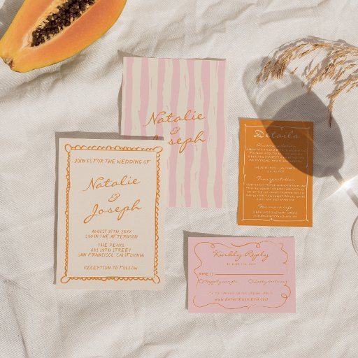 Este convite para o casamento é perfeito para o seu casamento se você está procurando um convite elegante único e fácil de ser editado. Um simples e elegante convite de modelo de casamento rosa e laranja, simples e minimalista, como você vê, apresenta um fundo de creme. E a mão laranja clara escreveu os primeiros nomes da noiva e do noivo e informações de script. E o quadro cor de laranja pintado à mão e o código QR personalizável no verso. Com fundo de pinstripe em rosa e creme. Barato e é também um e-convite eletrônico digital se você quiser enviá-lo por texto ou email. Todas as informações são personalizáveis clicando no botão personalizar. Então pegue-o e faça-o seu para que você faça você convidar noivos e excitados.