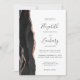 A borda esquerda deste convite de casamento moderno e elegante apresenta uma borda de ágata em aquarela preta aparada com brilho dourado rosa falso. O texto personalizável combina fontes manuscritas, copperplate e itálico em cinza carvão sobre um fundo branco. O verso fornece espaço para detalhes do casamento em um fundo branco sólido, juntamente com um código QR que os convidados podem escanear para visitar seu site e responder, o que economiza o custo de impressão e envio de cartões de resposta separados.