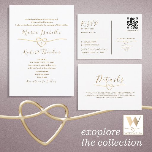 Simplifique seu planejamento de casamento com este elegante convite branco, com um romântico coração de corda de ouro falso. Sua design simples, moderna e mínima permite a versatilidade — você pode adicionar sua foto no verso, incluir seu site de casamento para obter detalhes e até mesmo um código QR para RSVP fácil. Perfeito para casais que procuram poupar espaço e dinheiro enquanto mantêm estilo!
