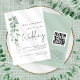 Casamento com Código QR em Elegante Letra de Eucalipto Moderno. Adicione o seu código QR no verso do seu site de casamento torna esta uma opção conveniente para os seus convidados responderem e verem todos os detalhes sem a necessidade de cartões separados de resposta e detalhes. Estilo botânico minimalista, com um conjunto de letra manuscrita para Casamento e o resto do texto que você pode facilmente personalizar. Um ramo elegante de folhas de eucalipto em aquarela desce pelo lado esquerdo.