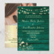 Celebre o seu grande dia com um convite elegante e moderno. Este design de madeira rústica verde esmeralda apresenta um código QR para RSVP, site, foto, renda floral boho dourada e luzes de corda.