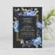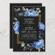 Faça a palco de um evento assombrosamente elegante com este convite gótico. Um luxo e luxuoso convite para o casamento floral, com um quadro de peões negros e azuis e bagas azuis contra fundo negro. Na parte de trás dos convites há um código QR RSVP e detalhes do casamento. É perfeito para uma celebração dramática e inesquecível. Eles são ideais para amantes do romance escuro e do atrativo do eterno. NOTA: O ouro representado neste design NÃO é folha REAL.