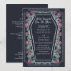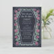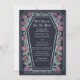 Faça uma declaração ousada de amor eterno. Este convite de casamento gótico apresenta 'Até a Morte nos Parte' em um quadro em forma de caixão, enfeitado com espinhos, rosas e sotaques prateados contra fundo azul profundo com seu próprio código QR na parte de trás do convite. Perfeito para uma comemoração romântica assombrosa! Personalize o texto, a fonte e a cor de fundo para se adequar às suas preferências de design. Correspondência de Itens em nosso compro para um tema completo de festa. Note que a prata do convite NÃO é uma folha real e é impressa em cores planas.