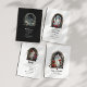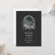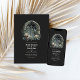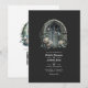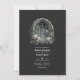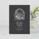 Convite de casamento gótico com janelas de castelo personalizáveis para os detalhes do seu evento. O código QR no verso direciona para o site do seu casamento, onde as pessoas podem saber mais e confirmar presença.