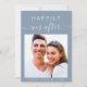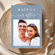 Convite para casamento moderno, azul e empoeirado, com a sua foto, "Feliz Nunca Depois", em uma simples tipografia branca e um roteiro de caligrafia branca com baloiços e seus primeiros nomes e data de casamento juntos por um coração. No verso, personalize seu convite em tipografia branca elegante e insira seu endereço no site do casamento para criar um código QR para seus convidados digitalizarem para RSVP on-line e para obter detalhes adicionais de casamento, como acomodações e instruções.
