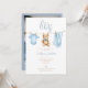 Este convite de chá de bebê fofo apresenta uma linda roupa de menino azul pendurada e pode ser personalizado com seus detalhes em uma tipografia elegante. O verso apresenta sua foto especial e um código QR de lista de presentes. Criado por Thisisnotme©