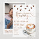 Este convite de chá de bebê elegante apresenta grãos de café e uma xícara de café e pode ser personalizado com seus detalhes definidos em tipografia elegante. O verso apresenta sua foto especial e um código QR do registro. Concebido por Thisisnotme©
