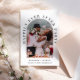 Fuga elegante ou anúncio de casamento privado e convite para recepção. A frente apresenta sua foto em uma moldura arqueada e "Festa Feliz para Sempre" em tipografia elegante. Abaixo da sua foto, adicione seus primeiros nomes, data e local do casamento. No verso, personalize seu convite, adicione seus nomes em uma escrita semelhante a uma assinatura e insira o endereço do site do seu casamento para criar um código QR escaneável para que seus convidados o escaneiem para responder online e obter detalhes adicionais.