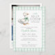 Este encantador convite para chás de fraldas apresenta um ganso bonito e um fundo de gingham verde. O reverso apresenta sua foto especial e um código QR de registro. Projetado por Thisnotme©