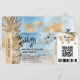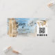 Convocação de casamento de praia de destino de ilhas tropicais Embarque Bilhete de Passagem Dourada no avião com RSVP, ícone de coração e avião com abacaxi. Adicionar seu código QR