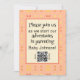 Celebre suas aventuras na parentalidade de seu novo bebê com a cor mais trendirosa de 2024, pêssego, em um design retrosolteiro com um código QR moderno para seus entes queridos para obter mais detalhes sobre seu evento. Calmante e calmante enquanto também se ergue, o pêssego é a cor da moenda de 2024, e esse design usa essa cor de três formas, em dois tons diferentes no design e como uma cor de fundo complementar. É uma divertida versão de padrão retrorreflector geométrico repetindo o Pêssego de Quatro Cantos e o design Amarelo, com o design a sair do produto para que você pense além das limitações do espaço. Não é assim que se passa com o fuzz do pêssego? Você pode mudar a cor de fundo para o que quiser! Vocês ainda estarão em tendência com a repetição de pêssego e design amarelo, mas não sem pensar em seguir a multidão. Este design de calmante funciona bem numa sala, quarto, área de habitação ao ar livre, ou num quarto de bebê ou criança. Design descrição: O design baseado em um dentro quadrado, embora nenhuma linha conecte os quadrados, seu cérebro faz isso funcionar para você. O quadrado dentro é amarelo mais escuro nos quatro cantos, não há design de conectar os cantos. Lá fora está outro quadrado, composto de amarelo mais claro nos quatro cantos, com duas daubs de pêssego entre cada canto. Há dois pêssegos, um mais vermelho e o outro mais amarelo, e as cores correspondentes se cruzam entre si. As seções do meio e do canto são agrupadas ao longo do padrão, o que cria a adição de quadrados de cor do solteiro. Descrição do texto: Todo texto é um modelo para que você possa mudar para o que quiser. Você também pode personalizar todas as fontes. O texto da frente diz, "Por favor juntem-se a nós quando começarmos as nossas aventuras na parentalidade Baby Johnson!" Abaixo está um código QR que você pode personalizar com seu registro de bebê ou site. Há texto modelo para dizer às pessoas o que está no código QR, com texto em ambos os lados. O verso tem o design subjacente, mas não há texto.