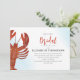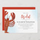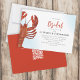 Esta design apresenta um chá de panela simples moderno, um simples marisco de lagosta vermelha costeira, com um código QR na página de eventos da URL da mídia social no Facebook, com um tema do assar de lagosta náutica, mar litoral ao largo do oceano, convite para eventos do janto de marisco, um texto de fonte da tipografia da tendência da na moda, com a moderna tipografia da escrita da caligrafia, uma nova Inglaterra Maine, Maryland, pernas de lagosta brancas fervem assar e água do oceano azul ondas do mar