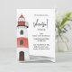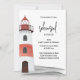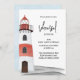 Esta design apresenta uma simples coloração aquática costeira náutica, um janto de ensaio na praia litoral à beira-mar, excelente para as festas do mar no verão, com um código QR para a URL do evento no Facebook, uma diversão certeira celebrada por um farol, com um roteiro de caligrafia de na moda, um branco vermelho e bonito, uma tipografia mínima minimalista simples, com ondas água e mar oceânico jantar convite