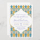 Azulejo moderno marroquino azul, amarelo e ouro, convite personalizado para casamento da arte marroquina. Este produto pode ser facilmente personalizado. Se precisar de ajuda para a personalização do produto ou se precisar de produtos correspondentes, por favor contacte-me através do Zazzle.