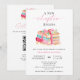Celebre um novo e doce começo com este encantador convite de chá de bebê temático de livro, de dois lados, apresentando uma pilha de livros em aquarela amarrados com uma fita rosa. A frente destaca os detalhes do convite “Um Novo Capítulo Começa”, enquanto o verso inclui um código QR de lista de presentes e endereço para facilitar o presente para os convidados.
