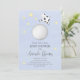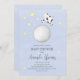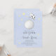 Esta design apresenta um guião capricho bonitinho e neutro em termos de gênero, com o URL da loja de códigos QR, com o website do registro de presentes, com uma vaca a saltar sobre o tema da lua, um guião elegante para a caligrafia, com o convite para o chá de fraldas da moda, e um céu azul e estrelas amarelas lua, ritmo tradicional clássico do berçário, um modelo de cartão-postal amigável em termos orçamentais, para a mãe, mãe mamãe