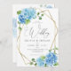 Casamento floral elegante, tudo em um convite. Convite de casamento botânico moderno com moldura digital geométrica de ouro, roteiro de caligrafia e flores pintadas manualmente de aquarela em azul claro com detalhes e código QR RSVP no verso. Você pode personalizar o texto, o estilo da fonte, a cor e o tamanho em frente e atrás do convite. Por favor, foi livre de me contactar para encontrar itens correspondentes.