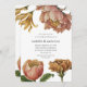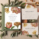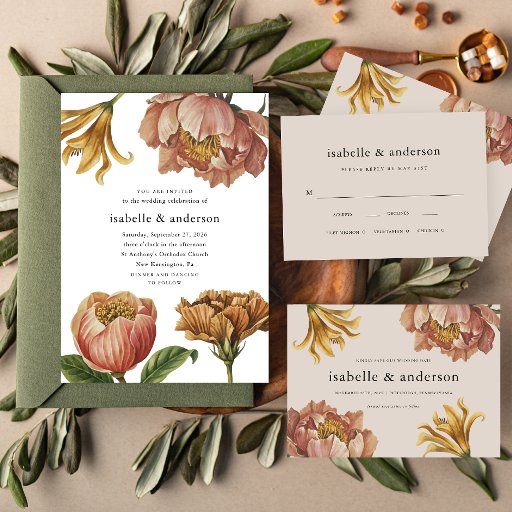 Este convite de casamento chic apresenta grandes imagens vintages com aspecto vermelho e elementos florais amarelos ouros e tipografia clássica com código qr rsvp e flores simples na parte de trás do cartão. Este elegante convite botânico é uma bela maneira de informar os convidados sobre a sua próxima celebração de casamento.
