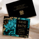Este elegante e melancólico casamento "Salve o cartão da data" apresenta um buquê floral romântico e luxuoso em turquesa com folha de ouro e folhagem brilhante num fundo negro. Personalize o texto dourado em fontes na moda em um retângulo preto e adicione um breve texto adicional ao verso, juntamente com um código QR para ajudar seus convidados a visitar o site do casamento.