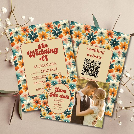Convites Código QR Groovy Retro 70s Casamento Floral