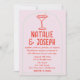 Este convite para o casamento é perfeito para o seu casamento, se você está procurando um convite de código QR de foto elegante único e fácil de editar. Um convite de modelo de casamento simples e rosa e vermelho. Que apresenta fundo rosa claro. E a mão vermelha escreveu os nomes da noiva e do noivo. Com um vidro martini ilustrado e esquisito desenhado à mão. Todas as dentro de um quadro de arco desenhado com a mão verde. e informações editáveis com código qr na parte traseira, juntamente com fotos personalizáveis. Barato e é também um e-convite eletrônico digital se você quiser enviá-lo por texto ou email. Todas as informações são personalizáveis clicando no botão personalizar. Então pegue-o e faça-o seu para que você faça você convidar noivos e excitados.