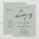 Tudo em um código QR RSVP Chic Modern Black Calliografia Script Sage Green Wedding Convite... Nosso convite de casamento verde de sábio minimalista apresenta um roteiro de caligrafia moderno combinado com texto de serif e sans serif para um convite de casamento simples e chic. A parte traseira do convite também exibe o código QR do seu site de casamento, assim como o próprio URL do site, permitindo que seus convidados RSVP online sejam facilmente acessados e visualizem todos os detalhes normalmente enviados em um pacote de casamento. O exemplo de modelo de gráfico de código QR e todo texto de exemplo (além dos elementos de caligrafia gráfica) podem ser facilmente revisados com suas próprias informações sobre o modelo de personalização.