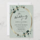 Código QR RSVP Eucalyptus Dourado Calliografia Moderna Convite de Casamento... Nosso convite de casamento botânico de dupla face apresenta um falso quadro de oval dourado embelezado com folhas de eucalipto abarrotadas de esmeralda em um plano de virada. A caligrafia moderna do chic exibe o texto de "Casamento de", "e", assim como a "recepção a seguir" acompanhada de uma tipografia serif elegante para o texto que você pode personalizar. A parte traseira do convite exibe o código QR do seu site de casamento, bem como o próprio URL do site, permitindo que seus convidados facilmente RSVP on-line e visualizem todos os detalhes normalmente enviados em um pacote de casamento. O exemplo de gráfico de código QR e todo texto de exemplo (além dos elementos de caligrafia gráfica) pode ser facilmente revisado com suas próprias informações sobre o modelo de personalização. ***Este design também pode ser adquirido como download digital, com ou sem convites em papel.
