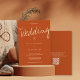 Um convite de casamento com um design de tipografia casual, mas moderno, e um código QR para o RSVP. Este convite de cor sólida laranja queimada acentua o grande evento com a palavra Casamento em uma fonte grande, estilo de escrita manual. O resto do convite é em tipografia limpa, aberta, que dá ao design uma estrutura forte. Este convite reflete a natureza relaxada, mas bem organizada, do seu casamento. Pronto para verificar convites fora da sua lista? Basta adicionar suas informações e o código QR, adicionar este convite ao seu carrinho e fazer um casamento de excelente. Código QR Tipografia Casual Queimada Laranja Invitação Feriado Design | ©Melissa Patton - Designer