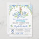 Convite para chá de fraldas com um lindo coelho de aquarela cercado de flores azuis e folhas verdes