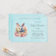 Convite de chá de bebê com imagem em aquarela. Um coelho branco cinza rodeado por uma guirlanda de rosas rosa e pêssego. Para amantes de coelhos e temas de Páscoa e aniversários e chás.