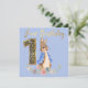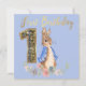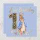 Coelho Peter em um fundo azul com o texto "Primeiro aniversário" em dourado com o número um dourado.