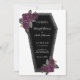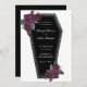 Muito escuro, este convite de casamento de caixão é perfeito para um casamento gótico ou de Halloween. O coffin tem brilho reluzente prateado ao redor das bordas e rosas roxas com folhas verdes de ouro e cinza. Veja a coordenação de itens no nosso compro, Encantado Finch.