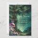 Uma ilustração com aquarela esbranquiçada de uma majestosa árvore numa floresta encantada, com folhagem exuberante em verde esmeralda, cintilante com luzes de fadas e poeira mágica, com um borrifo de cogumelos e borboletas em rosa e roxo, decora este primavera de verão outono chá de fraldas de inverno com um tema de floresta encantada. Um convite elegante e moderno para um chá de fraldas de conto de fadas. Perfeito para mães e pais que amam o cenário de conto de fadas, o tema da floresta de fadas ou do jardim de fadas, o tema cogumelo, o tema das borboletas e o verde-esmeralda, mauve, lavanda e rosa.