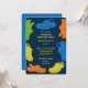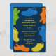 Jogue uma festa divertida para crianças ou adultos com esses convites de festas que apresentam ilustrações de calçados do estilo moccasin plástico ou entupimento em cores brilhantes. calçados verdes limões, azuis brilhantes, amarelos e laranja são colocados sobre um fundo azul marinho. Os detalhes do seu partido são apresentados em letras amarelas.