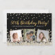 Design de convite de aniversário personalizado elegante com ouro e confete prateado sobre fundo preto, tipografia moderna com as palavras "50ª Festa de aniversário" (em ouro), seu nome e data de nascimento (em prata) e três de suas fotos favoritas emolduradas em folha de ouro metálica. Personalize-o com os detalhes do seu partido no verso do convite.