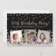 Convite de aniversário personalizado e elegante com design de confetes rose gold e prata sobre fundo preto, tipografia moderna com as palavras "Festa de 50º Aniversário" (em rose gold), seu nome e data de nascimento (em prata) e três de suas fotos favoritas emolduradas em folha metálica rose gold. Personalize com os detalhes da sua festa no verso do convite.