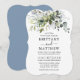 O Cartão de Convite para Casamento de Cores Biológicas Elegantes Modernos inclui folhas de eucalipto, folhagem botânica verde, folhas azuis empoeiradas e outros belos lençóis botânicos. Estilo do suporte. Pó Azul.