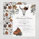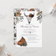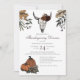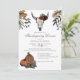 Este elegante convite de Ação de Graças ou de Ação de Amizade apresenta ilustrações temáticas desenhadas à mão no Western Fall Harvest a tinta preta, mostrando um crânio de vaca enfeitado com rosas, abóboras e folhas de outono. A parte de trás apresenta um belo padrão com estes elementos. Fundo branco.