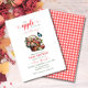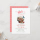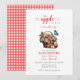 Apresentamos o nosso encantador convite ao Chá de fraldas em cores rosa, vermelha e branca. Um chá de fraldas temático de fruta com cor d'água rosa, vermelha e folhas verdes, um cesto de maçã na frente com detalhes editáveis de chá de fraldas, e xadrez na parte de trás do cartão para celebração inspirada em pomar. script e caligrafia na moda. #applebabyshower #appleofoureyebabyshower #applethemebabyshower
