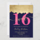 Folha de ouro gota a gota marinho elegante chic azul Sweet 16 com gotas de chic e folha de ouro na borda com um grande néon cor de rosa 16 em azul marinho editável. Adicione sua doce 16 foto com um roteiro de caligrafia elegante.