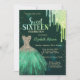Vestido verde elegante e brilho prateado pingam em um fundo verde.