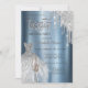 Vestidos elegantes de prata, vidro de champanhe e brilho prateado pingam em fundo metálico azul.