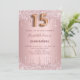 Um convite moderno, na moda e glamouroso para a Quinceañera, festa de aniversário 15. Um rosa poeirento, fundo cor-de-rosa com gotas elegantes, pintura pingando. O nome é escrito com um moderno e escuro, rosa dourado, escrito com letra de estilo manuscrito. Personalize e adicione os detalhes da sua festa. O número 15 é escrito com uma fonte de estilo balão, script.