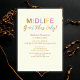 Celebrate turning 50 with a burst of positivity! This vibrant birthday invitation features the word “Midlife” in a bold serif font and “Good Vibes Only!” in a playful script font—each letter in a cheerful color, set against a soft white background. The front includes easy-to-customize party details in a flowing script font. The back adds a touch of calm with a soft purple backdrop. Simple, colorful, and full of joy—perfect for a milestone celebration!