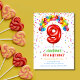 Estes convites de festas de aniversários bonitos e alegres apresentam um balão vermelho número 9 com balões coloridos e confete. Personalize os convites de festa de aniversário adicionando o nome, a idade e os detalhes da festa do seu filho.